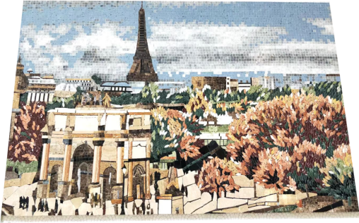 图9以艾菲尔铁塔为背景,融合各种自然风光、城市风貌的马赛克产品多么有诗意和意境,非常适合做背景墙;图10这幅表现马儿戏嬉玩耍的《百马图》,中国画的画风,山水画的意境,丹青的效果,美仑美奂,艺术韵味隽永。